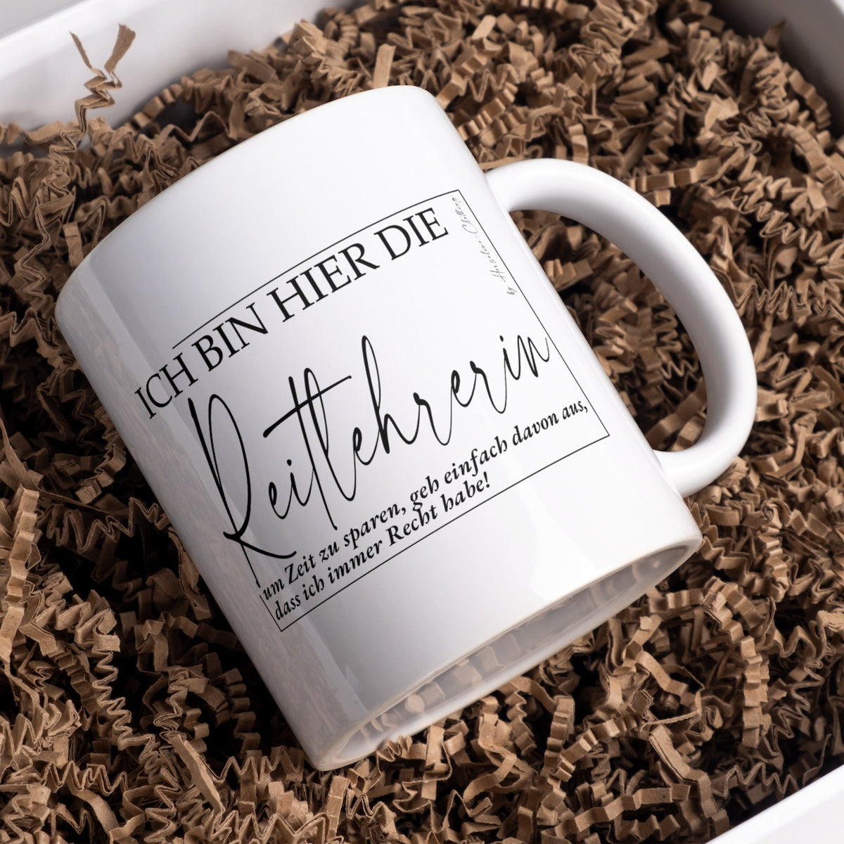 Wer bei Wind und Wetter auf dem Platz steht, wer "Absatz tief!" auch noch beim hundertsten Mal geduldig erklärt und wer Pferde besser versteht als Menschen – der hat sich eine heiße Tasse Kaffee (oder Tee) mehr als verdient. Unsere Tasse "Reitlehrerin" ist eine liebevolle Anerkennung für den wohl härtesten und schönsten Job der Welt.