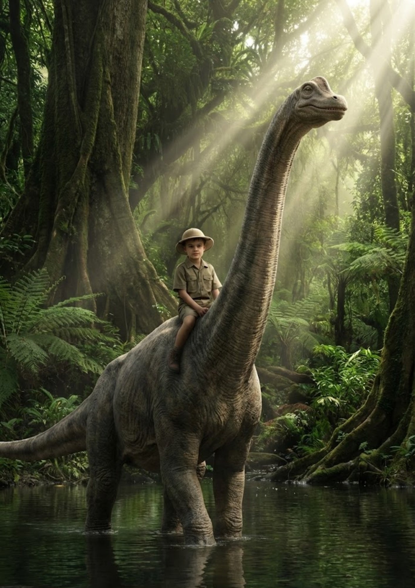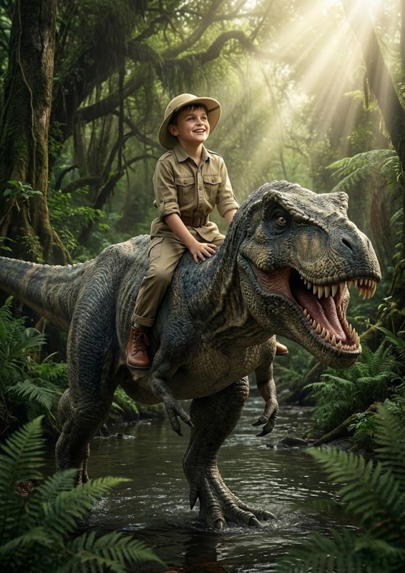 Urzeit-Magie: Unsere talentierten Designer setzen dein Kind professionell auf den Rücken eines freundlichen (aber mächtigen) T-Rex oder Langhals-Dinos. Wir passen Licht und Schatten perfekt an.