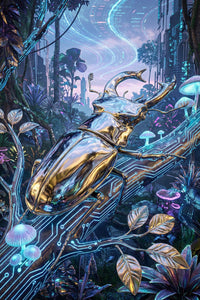 Ein Makrokosmos voller Details Das Motiv strotzt nur so vor futuristischer Energie: Der Käfer klettert auf einem Ast, der von leuchtenden blauen Schaltkreisen durchzogen ist – als würde er Daten direkt aus dem digitalen Wald saugen. Im Hintergrund ragen gigantische Neon-Pilze und futuristische Strukturen in einen Himmel voller Datenströme. Die metallischen Blätter am Wegesrand reflektieren das kühle Licht und erzeugen einen faszinierenden Gold-Silber-Kontrast.