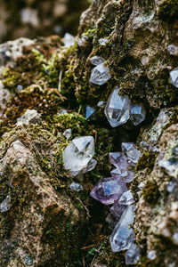 Ein Blickfang voller Details Das Motiv zeigt eine Ansammlung von klaren und zart-violetten Kristallen (erinnert an Amethyst oder Bergkristall), die direkt aus einer zerklĂŒfteten Felswand wachsen. Der harte, kalte Stein wird weich umspielt von lebendigem, grĂŒnem Moos. Dieser Kontrast zwischen dem organischen GrĂŒn, dem grauen Fels und der geometrischen Klarheit der Kristalle zieht den Betrachter sofort in den Bann.