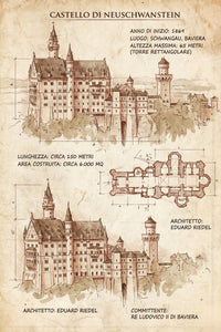 Poster Schloss Neuschwanstein im Da Vinci Stil – Historische Skizze als Wandbild