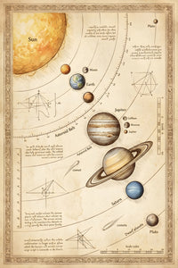 Das Motiv Auf einem Hintergrund in authentischer alter Pergament-Optik entfaltet sich unser Sonnensystem in wunderschönen, handgezeichneten Details. Von der mächtigen Sonne über die Erde bis hin zu Saturn mit seinen Ringen und dem Zwergplaneten Pluto – alle Himmelskörper sind kunstvoll illustriert. Ergänzt wird das Motiv durch geometrische Berechnungen, kunstvolle handschriftliche Notizen und Diagramme, die den Entdeckergeist vergangener Epochen einfangen. Ein eleganter ornamentaler Rahmen rundet das Gesamtbild ab.