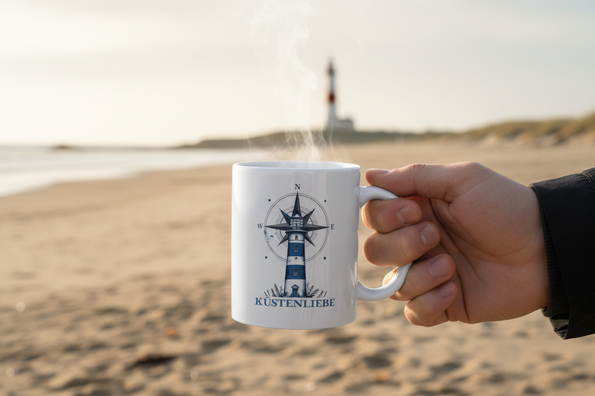 Der Leuchtturm ist das stärkste Symbol der Küste. Er steht für Sicherheit, Orientierung und das Gefühl, nach Hause zu kommen. Unsere Tasse "Küstenliebe" fängt genau diese Stimmung ein. Mit der detailreichen Kombination aus einem klassischen rot-weißen Leuchtturm und einem nostalgischen Kompass ist dieser Becher ein täglicher Begleiter für alle, deren Herz am Meer schlägt.