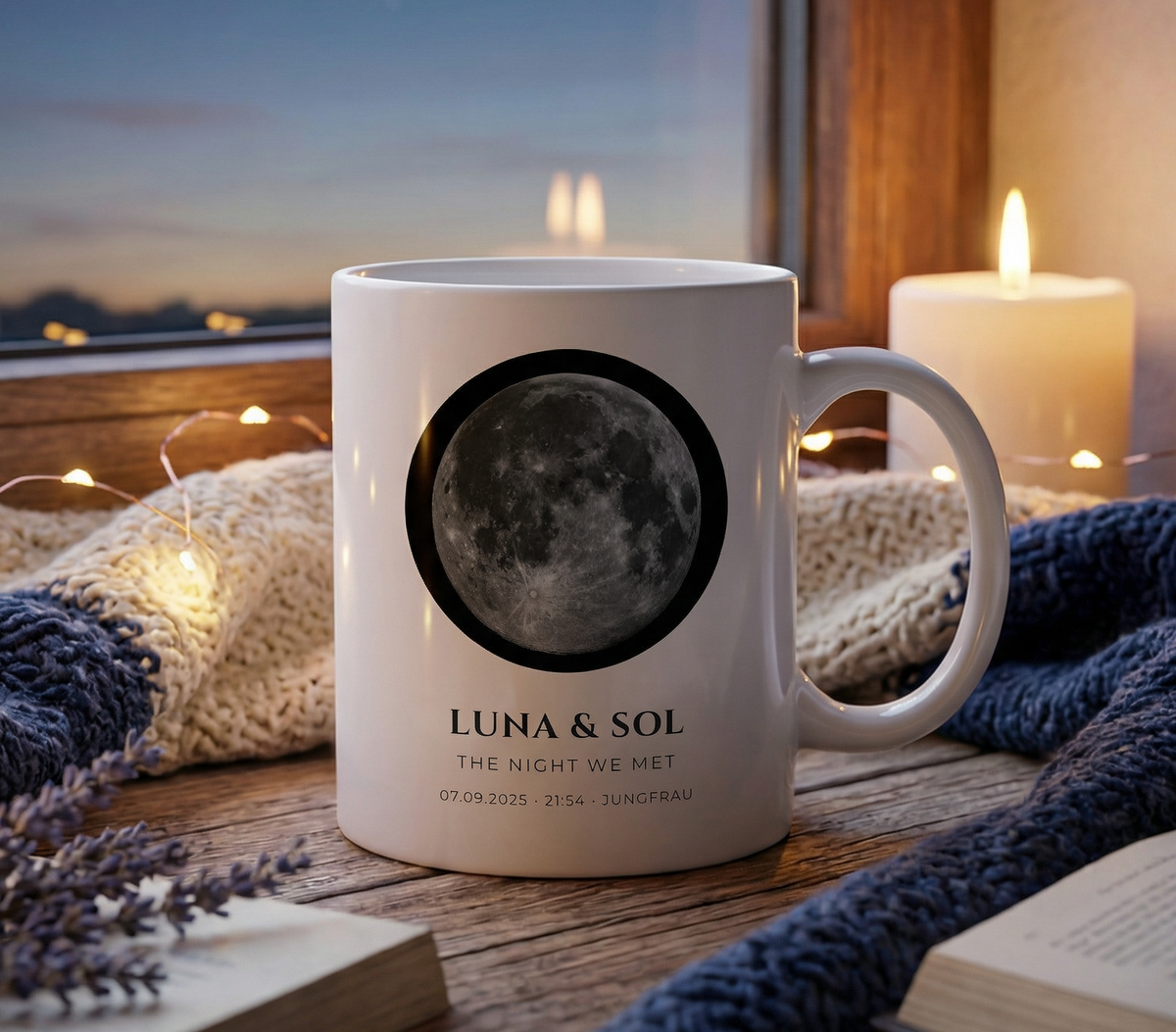 Ob der Tag deiner Geburt, der erste Kuss oder die Hochzeit: Wir berechnen den exakten Mondstand für dein Datum und verewigen ihn auf einer hochwertigen Keramiktasse. Inklusive Sternzeichen, Beleuchtungsgrad und deiner persönlichen Widmung.